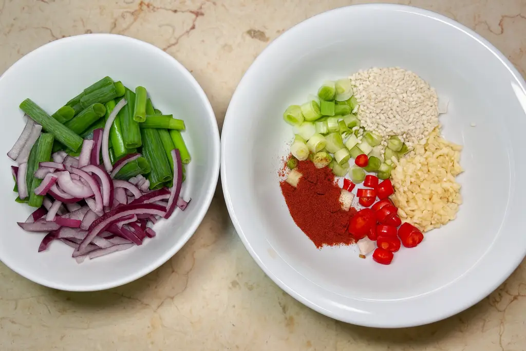 3. בקערה, ערבבי שום קצוץ, בצל ירוק קצוץ, שומשום, פפריקה מתוקה וטבעות צ'ילי; שפכי מעל שמן חם לשחרור הארומה. הוסיפי ½ כפית מלח, 2 כפות סויה, כף סוכר, 2 כפות חומץ אורז, מיץ מחצי ליים ו־3–4 כפות ממי הבישול של העוף; ערבבי היטב.